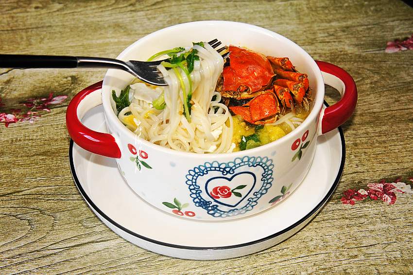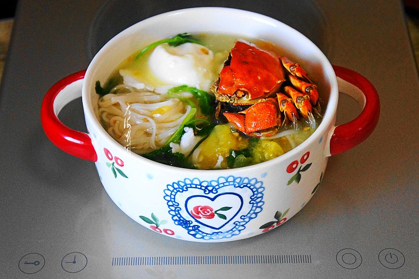 【陶瓷锅煮番茄热汤面】挂面200g;鸡蛋1个;黄番茄适量;香菜适量;香油适量;盐适量;大闸蟹1只;胡椒粉适量;生抽适量。