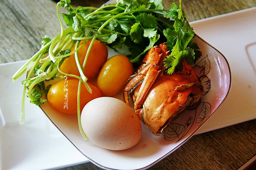 做法及步骤:1、备齐食材,香菜摘洗干净,番茄洗净,大闸蟹提前蒸熟。