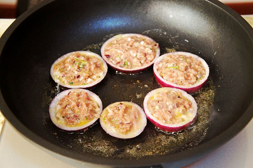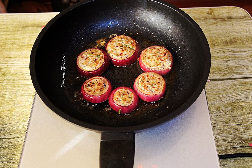 5、用小勺将调好的猪肉馅灌入洋葱圈中,上边压平,继续小火煎。非常棒的ACA电陶炉,特别容易控制火候,微晶面板特漂亮,微电脑控温,感应触摸操做,滑动手指即可调整温度,太爽了,简单又方便,8档火力可供选择,省时还省电,无油烟,干净。