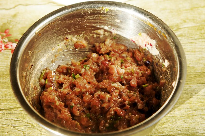 3、肉馅中加入蛋清、少许淀粉搅拌均匀至黏稠状态,加入洋葱碎、香菜碎、油、蚝油、盐、胡椒粉、蘑菇粉调味拌匀。