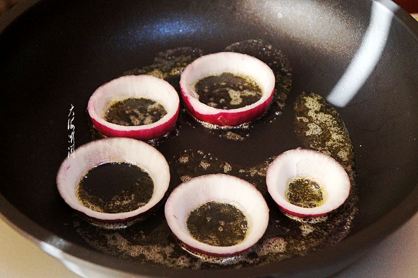 4、平底锅中加入黄油,小火融化黄油,没有黄油可用植物油。选择合适大小的洋葱圈,码入锅中。