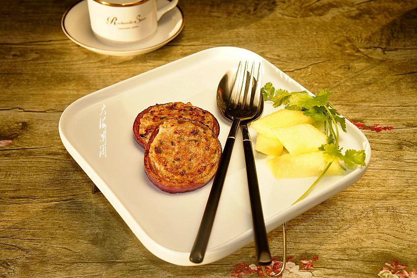 7、出锅装盘,口感嫩滑,味道鲜美,这肉饼中西餐都是不错的选择。