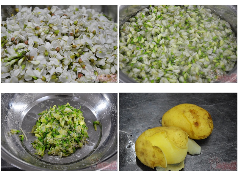 1、槐花摘洗干净,入开水锅中烫一下捞出过凉;