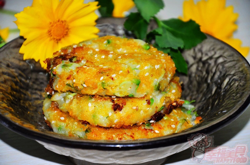 美食食材:槐花100克,土豆2个,面包糠适量,白芝麻适量