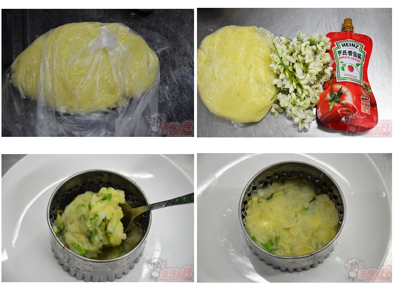 2、土豆洗净入蒸锅蒸熟,去皮后放入塑料袋中碾压成泥;