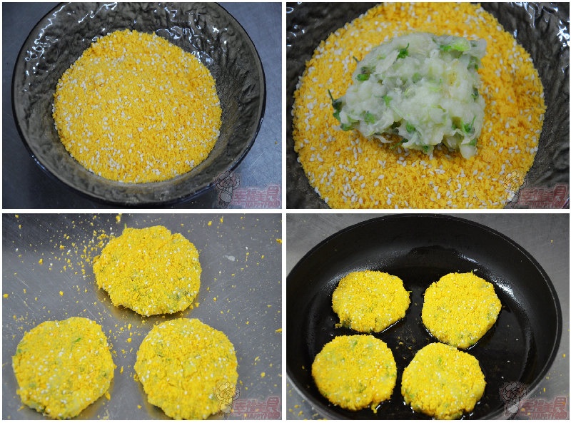 5、将拌好的土豆泥挖一小勺放到面包糠里,按压成饼,使之两面沾匀面包糠;