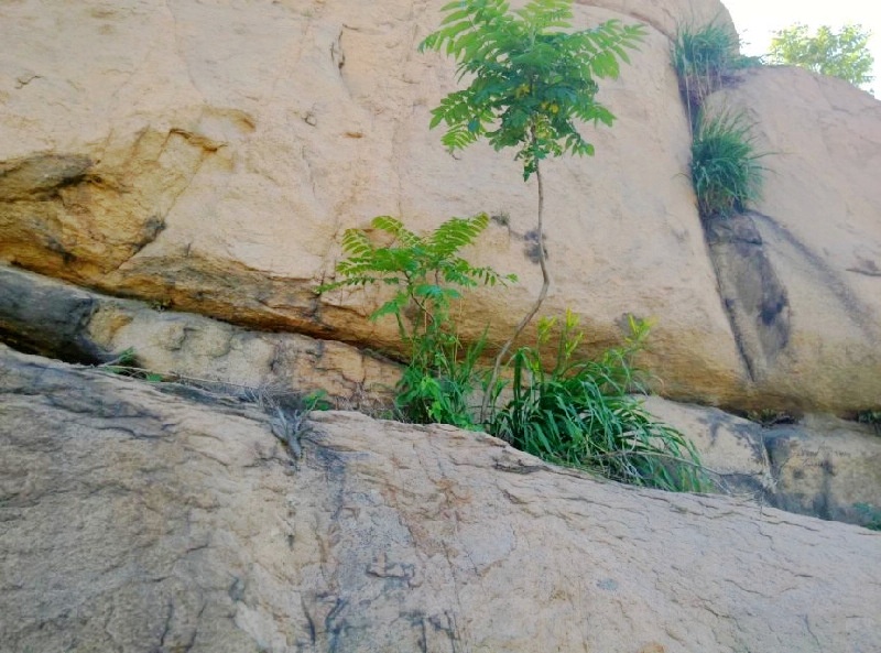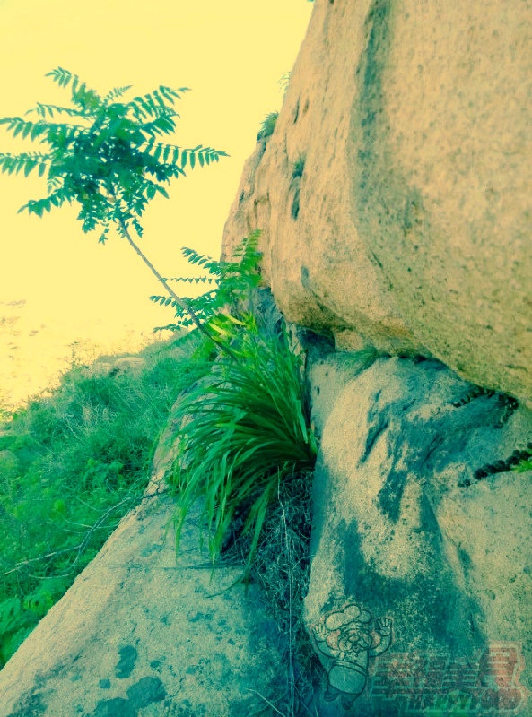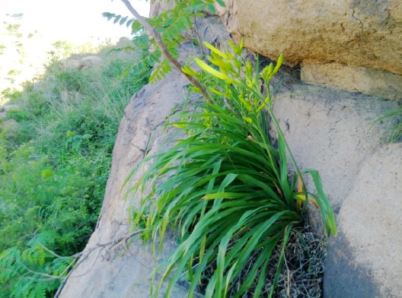 无功而返准备下山,还是自己一贯的作风,不走寻常路,准备从一个峭壁处下山,顺便看看能不能见到这黄花大闺女。结果真是苍天不枉有心人,因为是峭壁,下的时候自然要蹲下身子,用手攀住岩石,结果就在峭壁的岩石中发现了黄花菜优美的身姿,在随微风轻轻晃动,像一个微笑的少女,和我打着招呼。