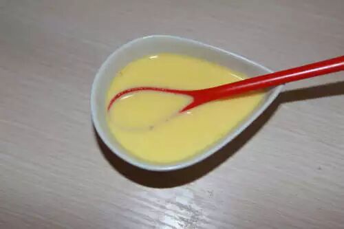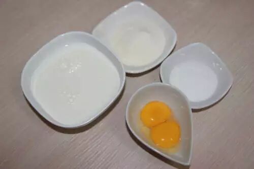 2.蛋黄中加入50g牛奶搅拌均匀