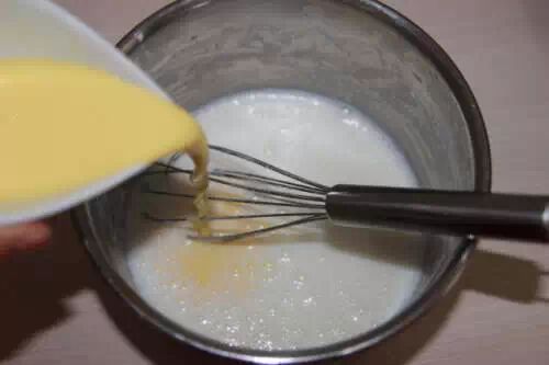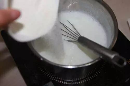 4.一边慢慢倒入布丁砂糖粉一边慢慢搅拌
