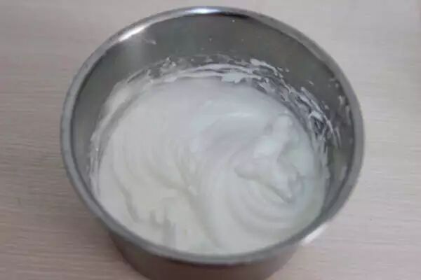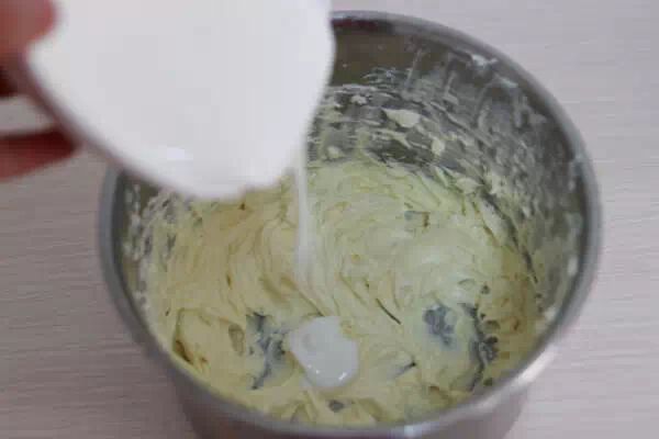 2,淡奶油与老酸奶混合均匀,分多次加入奶油奶酪中,用手动打蛋器搅拌均匀