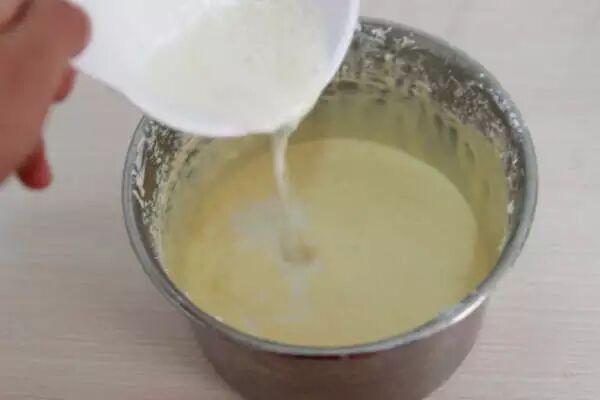 5,加入牛奶和柠檬汁搅拌均匀,成为比较稀的蛋糕糊
