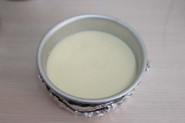 9,制作好的蛋糕糊倒入包好锡纸的活底模中,放入预热好的烤箱下层,隔水烘烤