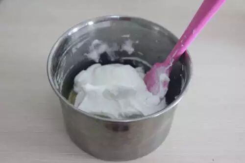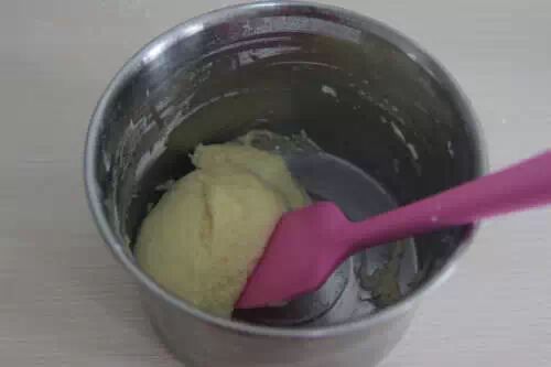 5, 取1/3蛋白倒入面糊中,用刮刀拌匀