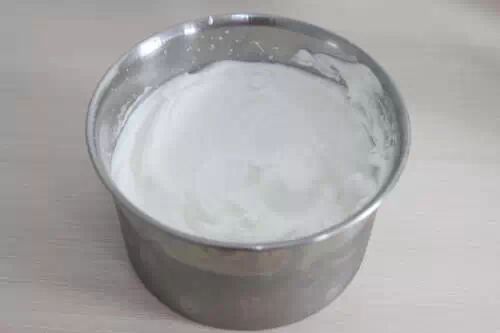 4, 蛋白分3次加入细砂糖,用电动打蛋器打发至干性发泡