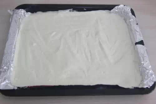 7, 抹平蛋糕糊表面,放入预热好150°的烤箱中层,烤15-18分钟。烤好的蛋糕连同锡纸一同取下来,稍凉之后,翻面,撕下锡纸