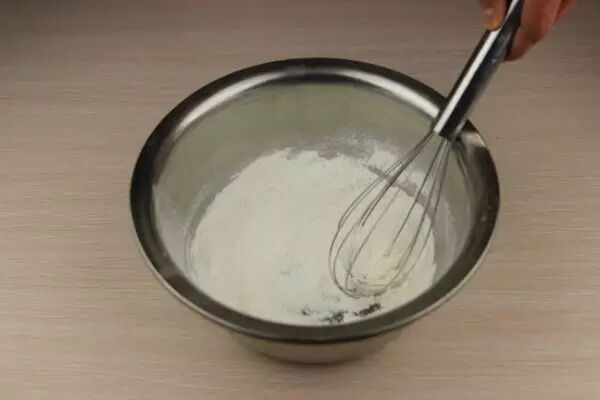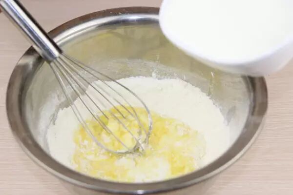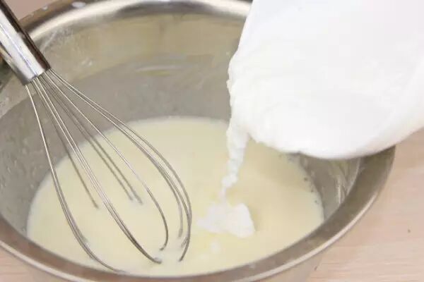 4.倒入打散的蛋液,再慢慢加入牛奶,一边加一边搅拌,直到完全混合均匀