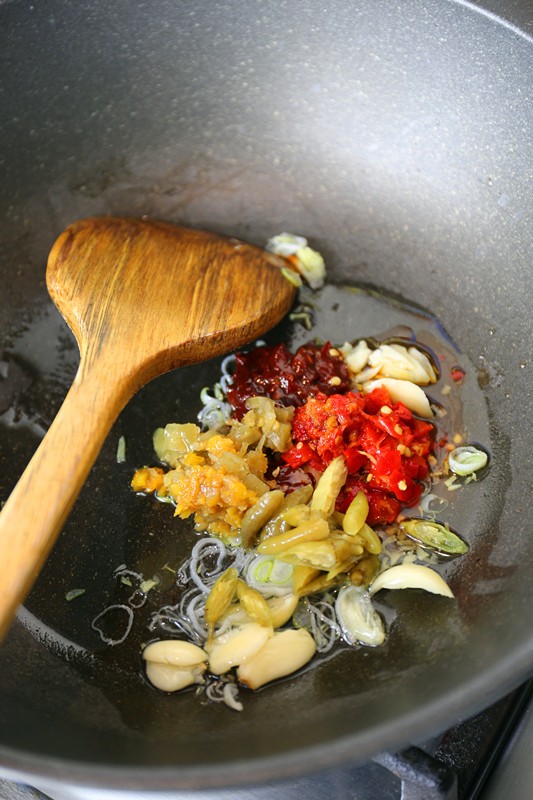 3、加郫县豆瓣酱、红剁椒酱、黄灯笼椒酱、泡椒炒出红油和香味