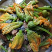 南瓜花、皮蛋、瘦肉、酱油、蒜米。