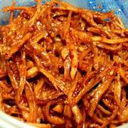 鱿鱼丝、白糖、食用油、蒜泥、辣椒粉、酱油、白醋、椒酱、料酒、蜂蜜、沙拉酱、熟芝麻、水。