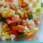 隔夜米饭、鸡蛋、红萝卜丁、火腿丁、蒜苔、红辣椒。