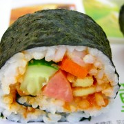米饭、海苔、黄瓜条、鸡蛋饼、红萝卜条、火腿、包饭酱、糖、盐、白醋。