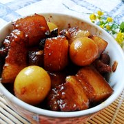 五花肉、食用油、盐、冰糖、姜、蒜、干辣椒、醋、老抽、桂皮、八角、鹌鹑蛋。