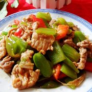 莴笋、红椒、猪瘦肉、油、盐、白糖、老抽、生粉、料酒、香油、味精、葱、姜。