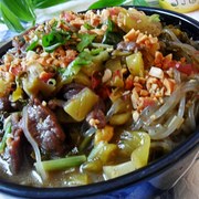 牛后腿肉、酸菜、红薯粉丝、盐、鸡精、葱、姜、蒜、胡椒粉、辣椒粉、花生碎、熟芝麻、香菜碎、小苏打、生粉、料酒。