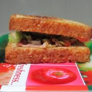 吐司、培根、意式肉饼、生菜丝、辣椒酱。