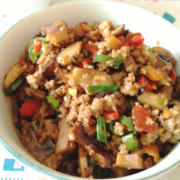 肉末、香菇、辣椒、葱、姜、蒜、盐、老抽。