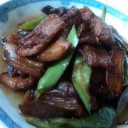 五花肉、花椒、姜片、蒜头、香叶、八角、青椒、盐、生抽、料酒、白糖、鸡精。