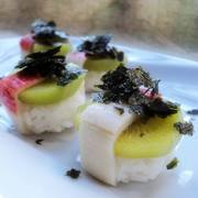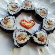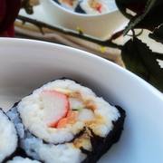 米饭、蛋皮、胡萝卜、蟹肉棒、肉松、黄瓜、紫菜、苹果醋。