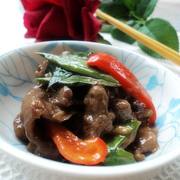 牛肉、甜红椒、青蒜、姜片、香叶、盐、生抽、料酒、地瓜粉、胡椒粉、鸡精、色拉油。