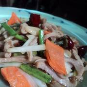 猪肚丝、胡萝卜、韭黄、葱段、蒜片、姜片、辣椒圈、料酒、鸡精、盐、生抽、胡椒粉、香醋。