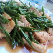 豆腐、韭薹、色拉油、盐、生抽、料酒、辣椒粉、鸡精、清水。