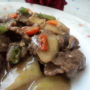 牛肉、胡萝卜、黄瓜、青红辣椒、蒜头、姜片、淀粉、盐、生抽、料酒、黑胡椒汁、鸡精。