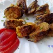 茄子、肉末、熟玉米、西红柿、香葱末、面粉、鸡蛋、地瓜粉、生抽、盐、鸡精、清水、色拉油、椒盐。