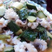 墨鱼、黄瓜、葱段、姜片、盐、糖、辣椒粉、白醋、生抽、水淀粉、啤酒、鸡精。