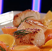 扇贝、胡萝卜、黄色的胡萝卜、鲜奶油、橄榄油、醋、盐和胡椒。