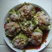 茄子、肉馅、生粉、葱、蒜、蒸鱼鼓油。