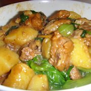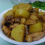 鸡、土豆、油豆腐、姜、干葱头、蒜头、啤酒。