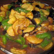 土豆、辣椒、茄子、葱、姜丝、淀粉、食用油、盐、鸡精、酱油。