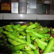 腊肠、菜豆、葱花、食用油、食用盐、鸡精。