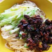 炸酱、胡萝卜、葱花、食用油、猪肉、干面条、黄瓜。