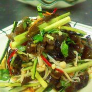 金针菇、青瓜、水发木耳、胡萝卜、蒜头、香菜、红尖椒、陈醋、味极鲜酱油、味精、糖、辣椒油。