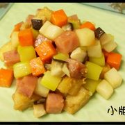 豆腐、火腿、胡萝卜、鲜香菇、芦笋、马蹄、蒜茸、美极鲜酱油、盐、糖、鸡粉、蚝油、橄榄油、淀粉水。