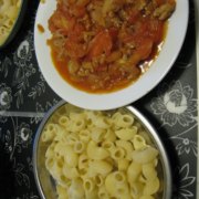 通心粉、番茄、洋葱、肉碎、番茄酱。