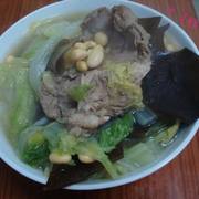 猪扇骨、白菜、黄豆、海带、盐、鸡精、大料、桂皮、料酒、姜。