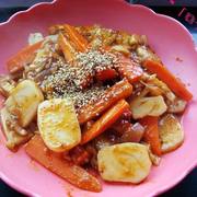 年糕片、胡萝卜、葱、韩式辣酱、白芝麻。