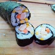 玉米、大片紫菜、大米饭、胡萝卜、香肠、鸡蛋、盐、鸡精、香油。